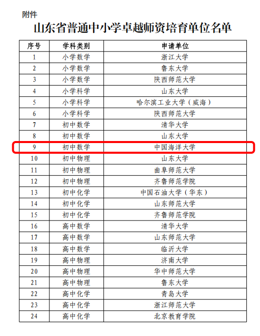 日前,山东省教育厅发布面向全国高水平师范院校和综合大学遴选山东省普通中小学卓越师资培育单位,面向小学科学、小学数学、初中数学等学科开展卓越师资培育。经自主申报、专家评审与面试答辩等环节,中国海洋大学成功入选“初中数学学科卓越师资培育单位”,与清华大学、山东大学共同承担山东省初中数学学科卓越师资培训工作。