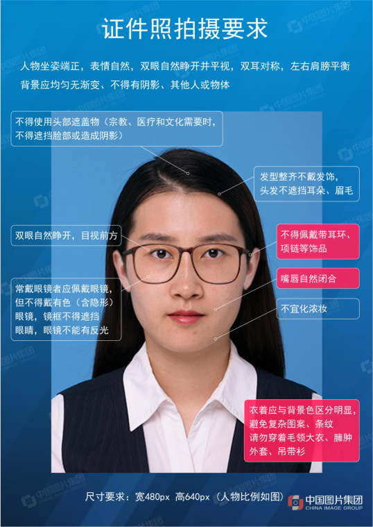 1.拍照时不可佩戴首饰、美瞳、头发不可遮挡眉毛及耳朵,不可露齿、眼镜不能有反光、镜框不得遮挡眼部轮廓、不宜化浓妆。